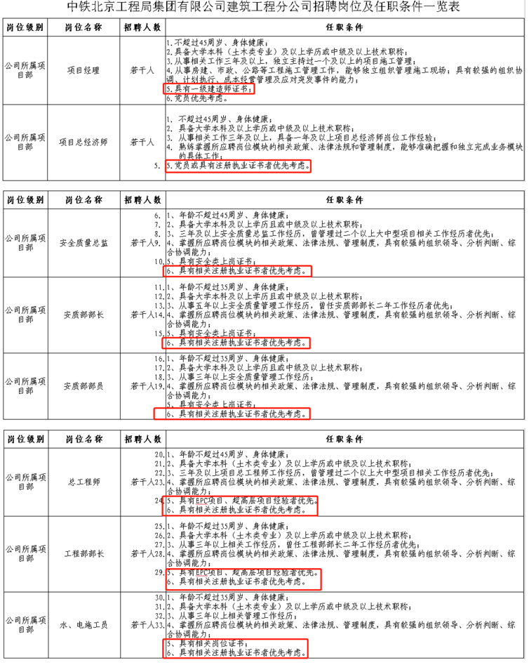 1.《中鐵北京工程局集團有限公司建筑工程分公司招聘崗位及任職條件一覽表》