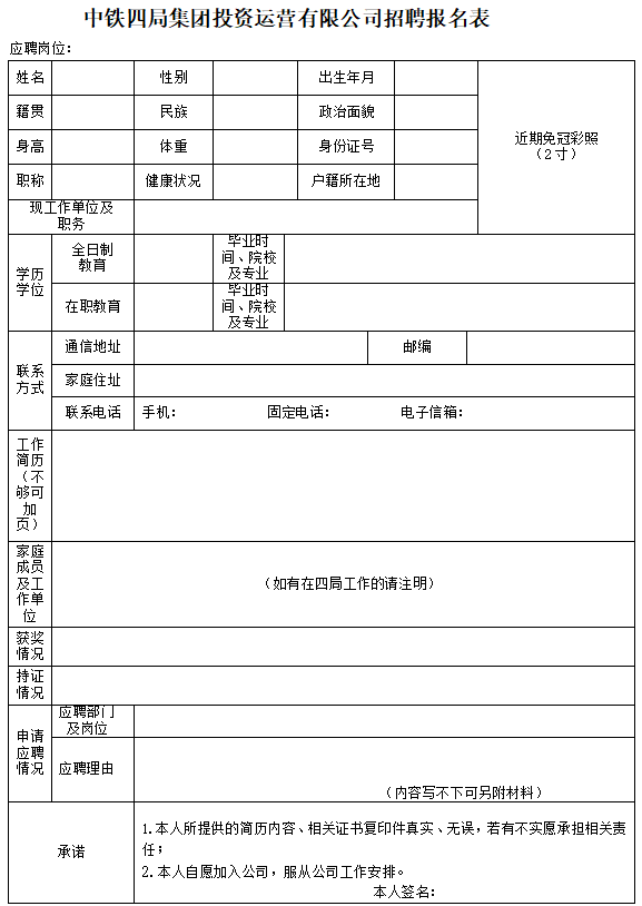 1.《中鐵四局集團投資運營有限公司招聘報名表》電子版(附件2,見文末),由本人如實填寫。