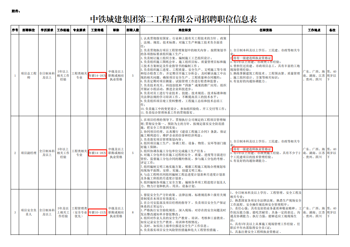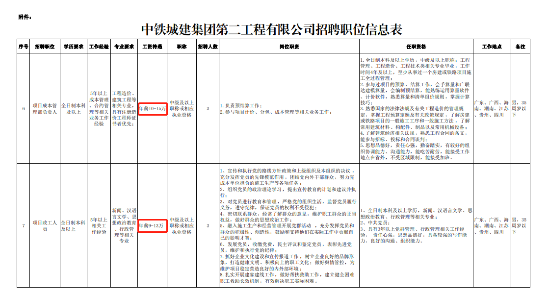 本次招聘崗位為中鐵城建二公司所屬項(xiàng)目部專業(yè)技術(shù)人員和管理人員。招聘崗位情況如下: