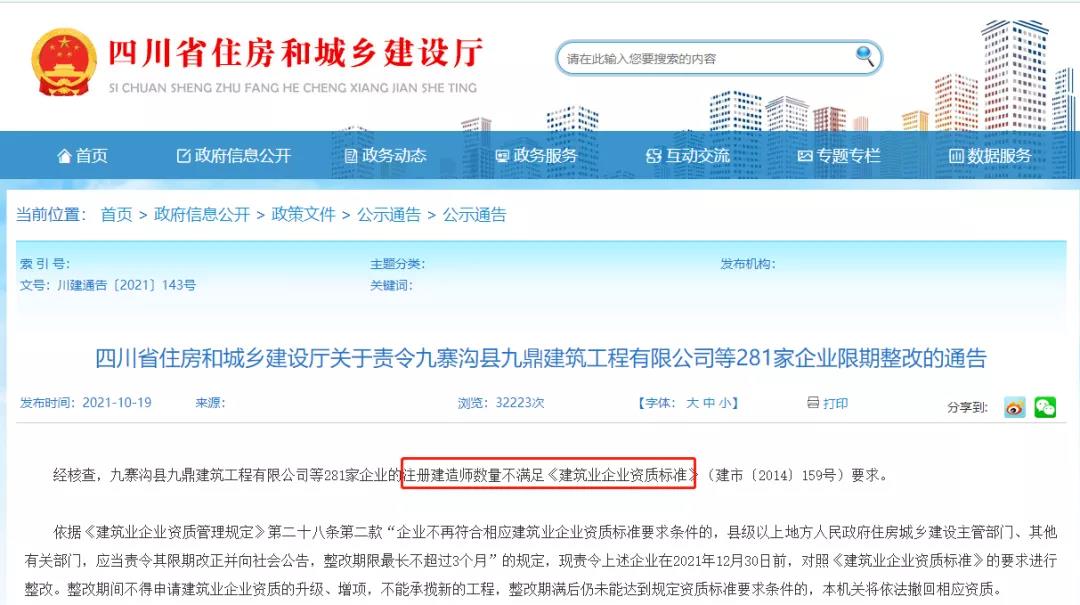 10月19日,四川省住房和城鄉(xiāng)建設(shè)廳發(fā)布通告,責(zé)令九寨溝縣九鼎建筑工程有限公司等281家企業(yè)限期整改。