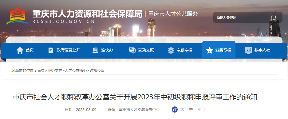 根據(jù)《重慶市人力資源和社會(huì)保障局關(guān)于印發(fā)<重慶市職稱評審管理辦法>的通知》(渝人社發(fā)〔2021〕25 號)《重慶市人力資源和社會(huì)保障局辦公室關(guān)于做好我市流動(dòng)人員職稱申報(bào)評審工作有關(guān)事項(xiàng)的通知》(渝人社辦〔2017〕235 號)等文件要求,結(jié)合重慶市社會(huì)人才職稱改革辦公室(以下簡稱“社會(huì)人才職改辦”)職稱申報(bào)評審工作實(shí)際,為確保2023年中初級職稱評審及資格審查工作有序進(jìn)行,現(xiàn)將有關(guān)事項(xiàng)通知如下: