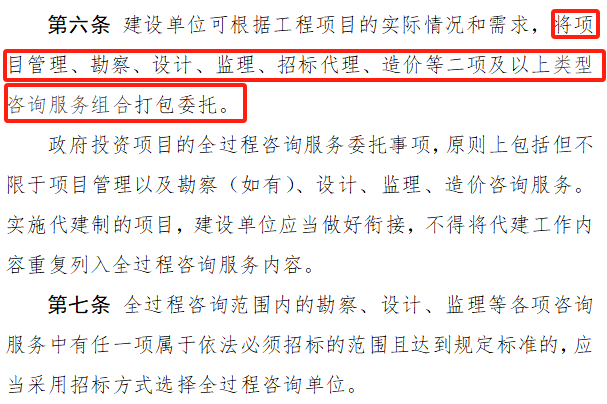 建設(shè)單位可根據(jù)工程項目的實際情況和需求,將項目管理以及勘察、設(shè)計、監(jiān)理、招標(biāo)代理、造價等咨詢服務(wù)全部或部分打包委托。