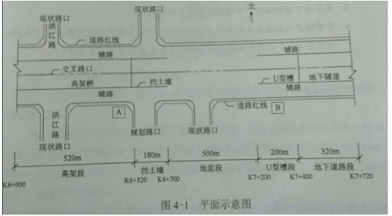 背景資料某市區(qū)城市主干道改擴(kuò)建工程,標(biāo)段總長1.72km,周邊有多處永久建筑,臨時(shí)用地極少,環(huán)境保護(hù)要求高;現(xiàn)狀道路交通量大,施工時(shí)現(xiàn)狀交通不斷行。本標(biāo)段是在原城市主干路主路范圍進(jìn)行高架橋段-地面段-入地段改擴(kuò)建,包括高架橋段、地面段、U型槽段和地下隧道段。各工種施工作業(yè)區(qū)設(shè)在圍擋內(nèi),臨時(shí)用電變壓器可安放于圖4-1中A、B位置,電纜敷設(shè)方式待定。