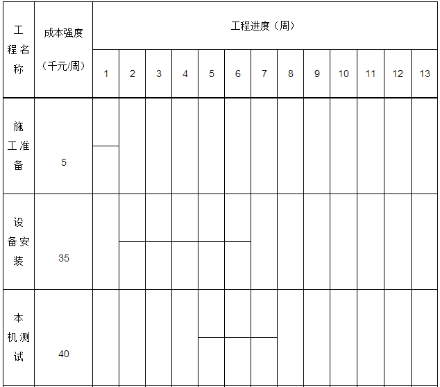 1、根據(jù)橫道圖用直方圖形式繪制,按周編制成本計劃 答:根據(jù)進度計劃橫道圖,繪制進度計劃成本矩陣見下表: