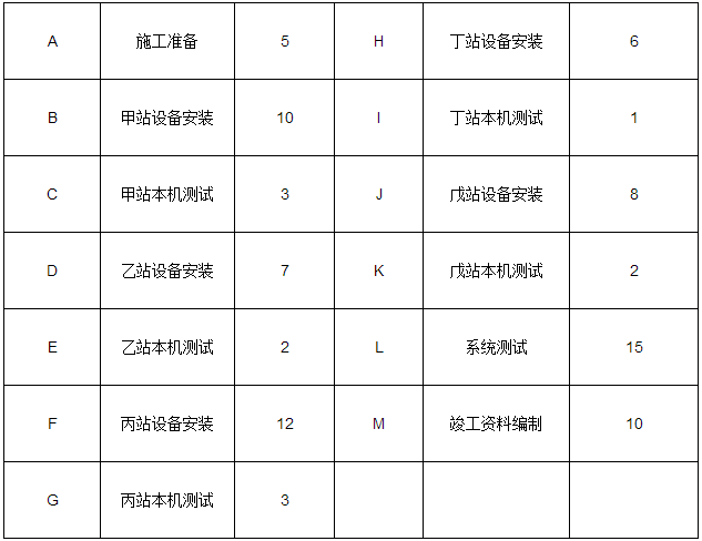 事件一:乙站、丙站設(shè)備均推遲 2 天運到機房; 事件二:施工單位儀表比計劃最早進場時間推遲 5 天時間; 事件三:在丁站本機測試中,儀表故障造成測試工作延遲 6 天;