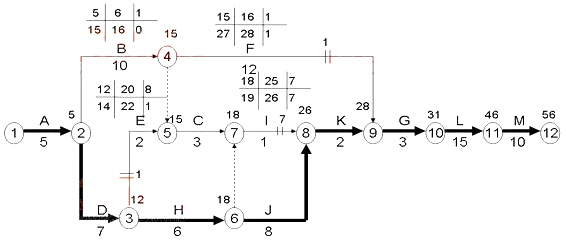 計劃工期=5(A)+7(D)+6(H)+8(J)+2(K)+3(G)+15(L)+10(M)=56(天)