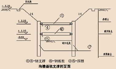 事件一:項目部進場后立即編制施工組織設(shè)計,擬將表層雜填土放坡挖除后再打設(shè)鋼板樁,設(shè)置兩道水平鋼支撐及型鋼圍檁,溝槽支護如下圖所示。溝槽擬采用機械開挖至設(shè)計標(biāo)高,清槽后澆筑混凝土基礎(chǔ),混凝土直接從商品混凝土輸送車上卸料到坑底。