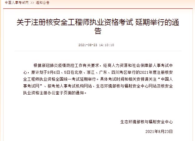 根據(jù)新冠肺炎疫情防控工作有關(guān)要求,經(jīng)商人力資源和社會保障部人事考試中心,原計劃于9月4日、5日在北京、浙江、廣東、四川考區(qū)舉行的2021年度注冊核安全工程師執(zhí)業(yè)資格全國統(tǒng)一考試延期舉行。具體考試時間和相關(guān)安排請關(guān)注“中國人事考試網(wǎng)”、報考地人事考試機(jī)構(gòu)網(wǎng)站、生態(tài)環(huán)境部核與輻射安全中心網(wǎng)站及核安全執(zhí)業(yè)資格注冊辦公室子頁面的通知。