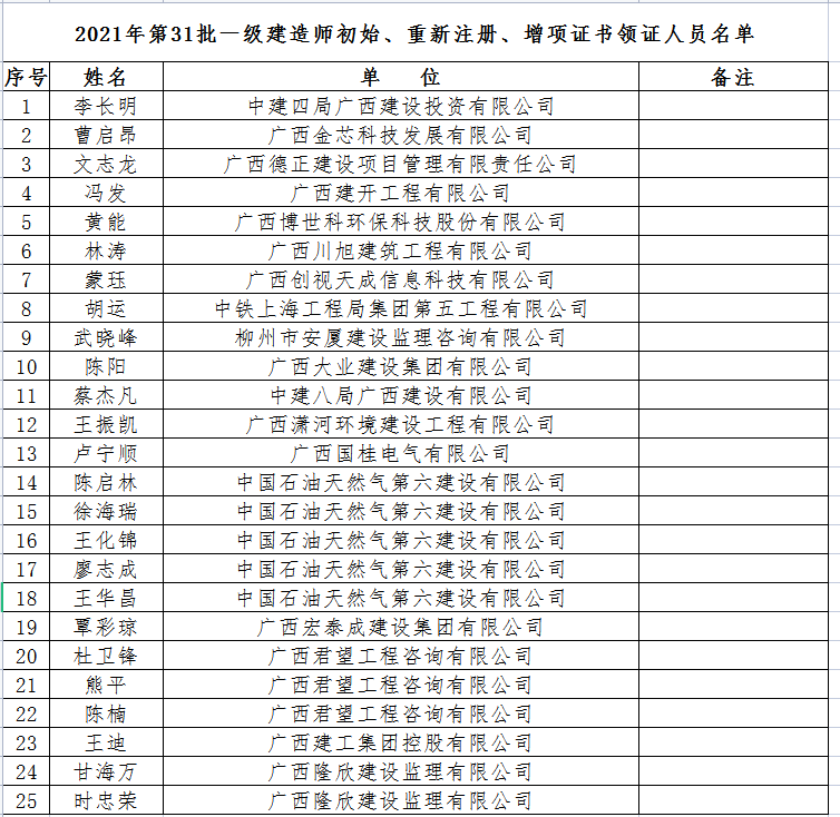 附件:2021年第31批一級建造師初始、增項、重新注冊證書領(lǐng)取人員名單