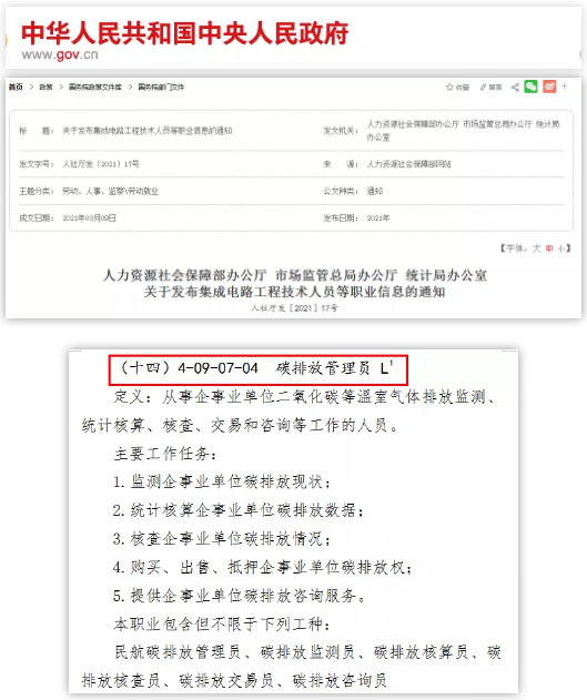 (3) 且在2021年3月,人社部、國(guó)家市場(chǎng)監(jiān)管總局、國(guó)家統(tǒng)計(jì)局發(fā)布了 18 項(xiàng)新職業(yè),"碳排放管理員" 被列入國(guó)家職業(yè)序列,并在該職業(yè)下設(shè)置了:“民航碳排放管理員”、“碳排放監(jiān)測(cè)員”、“碳排放核算員”、“碳排放核查員”、“碳排放交易員”、“碳排放咨詢員”6個(gè)工種。通知如下: