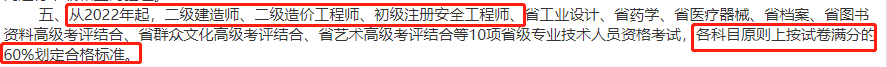 五、從2022年起,二級建造師、二級造價工程師、初級注冊安全工程師、省工業(yè)設(shè)計、省藥學、省醫(yī)療器械、省檔案、省圖書資料高級考評結(jié)合、省群眾文化高級考評結(jié)合、省藝術(shù)高級考評結(jié)合等10項省級專業(yè)技術(shù)人員資格考試,各科目原則上按試卷滿分的60%劃定合格標準。