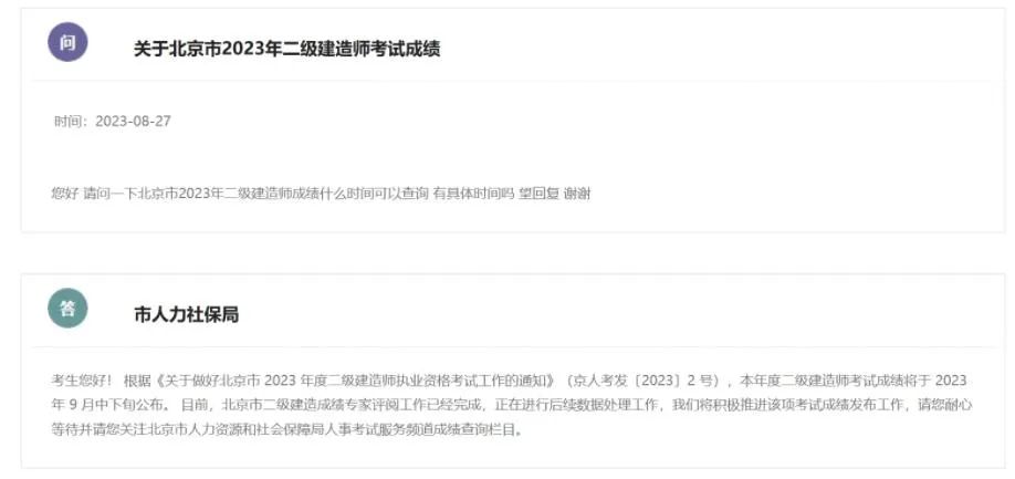 另外考生詢問:關(guān)于北京二建成績什么時候公布。官方回復:將于9月中下旬公布。