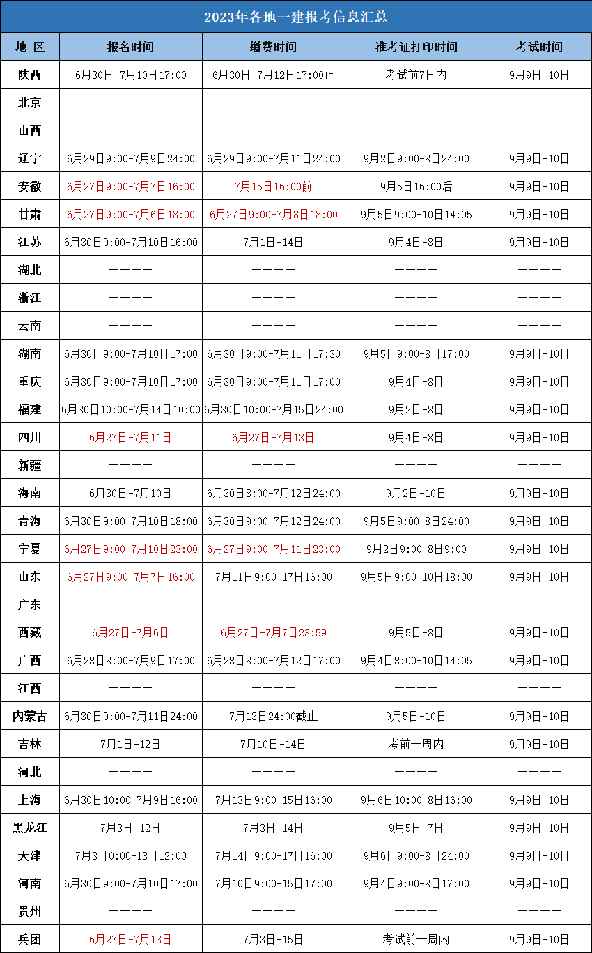近日,又新增天津、上海、黑龍江、寧夏、重慶、兵團(tuán)幾地發(fā)布了2023年一級建造師相關(guān)的報考通知,通知中明確了報名繳費(fèi)時間以及其他幾個重要的時間信息。下面給大家進(jìn)行一個匯總并展示在下方~