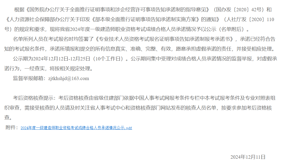 公示期為2024年12月12日-12月25日(10個工作日)。公示期間集中受理對成績合格人員承諾情況的監(jiān)督舉報,對虛假承諾行為,一經(jīng)查實(shí),將按相關(guān)規(guī)定處理。