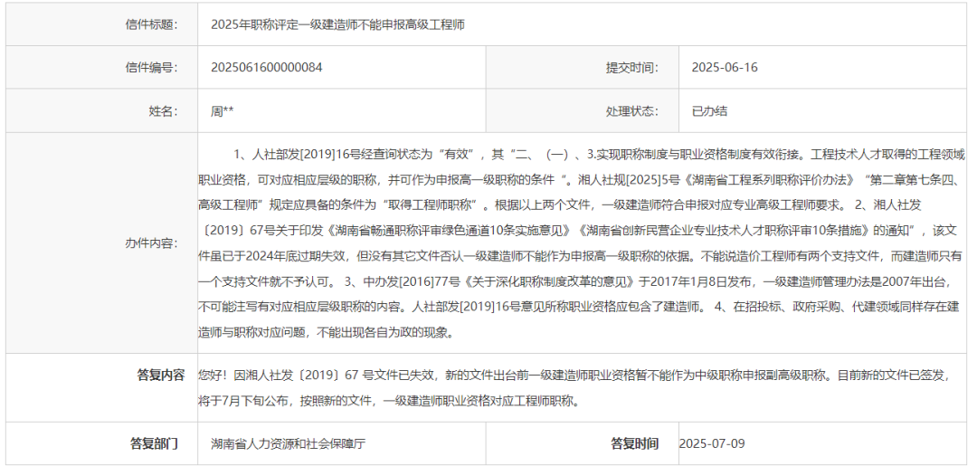 2、湘人社發(fā)〔2019〕67號關(guān)于印發(fā)《湖南省暢通職稱評審綠色通道10條實施意見》《湖南省創(chuàng)新民營企業(yè)專業(yè)技術(shù)人才職稱評審10條措施》的通知”,該文件雖已于2024年底過期失效,但沒有其它文件否認一級建造師不能作為申報高一級職稱的依據(jù)。不能說造價工程師有兩個支持文件,而建造師只有一個支持文件就不予認可。