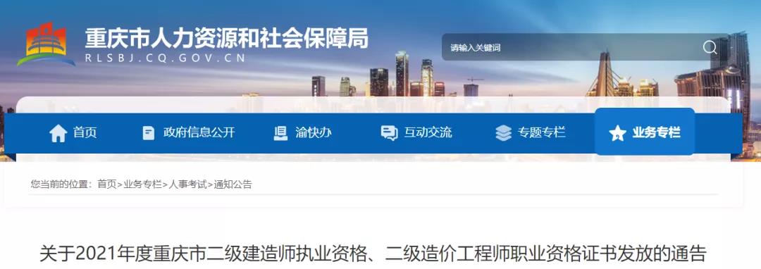 12月16日,重慶市人力資源和社會保障局發(fā)布《關(guān)于2021年度重慶市二級建造師執(zhí)業(yè)資格、二級造價工程師職業(yè)資格證書發(fā)放的通告》,2021年重慶二級建造師證書,12月31日起陸續(xù)寄出,2022年1月4-12日可現(xiàn)場領(lǐng)取。通知詳情如下: