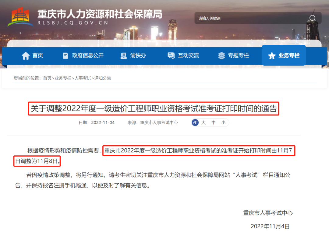 重慶市2022年度一級造價工程師職業(yè)資格考試的準(zhǔn)考證開始打印時間由11月7日調(diào)整為11月8日。