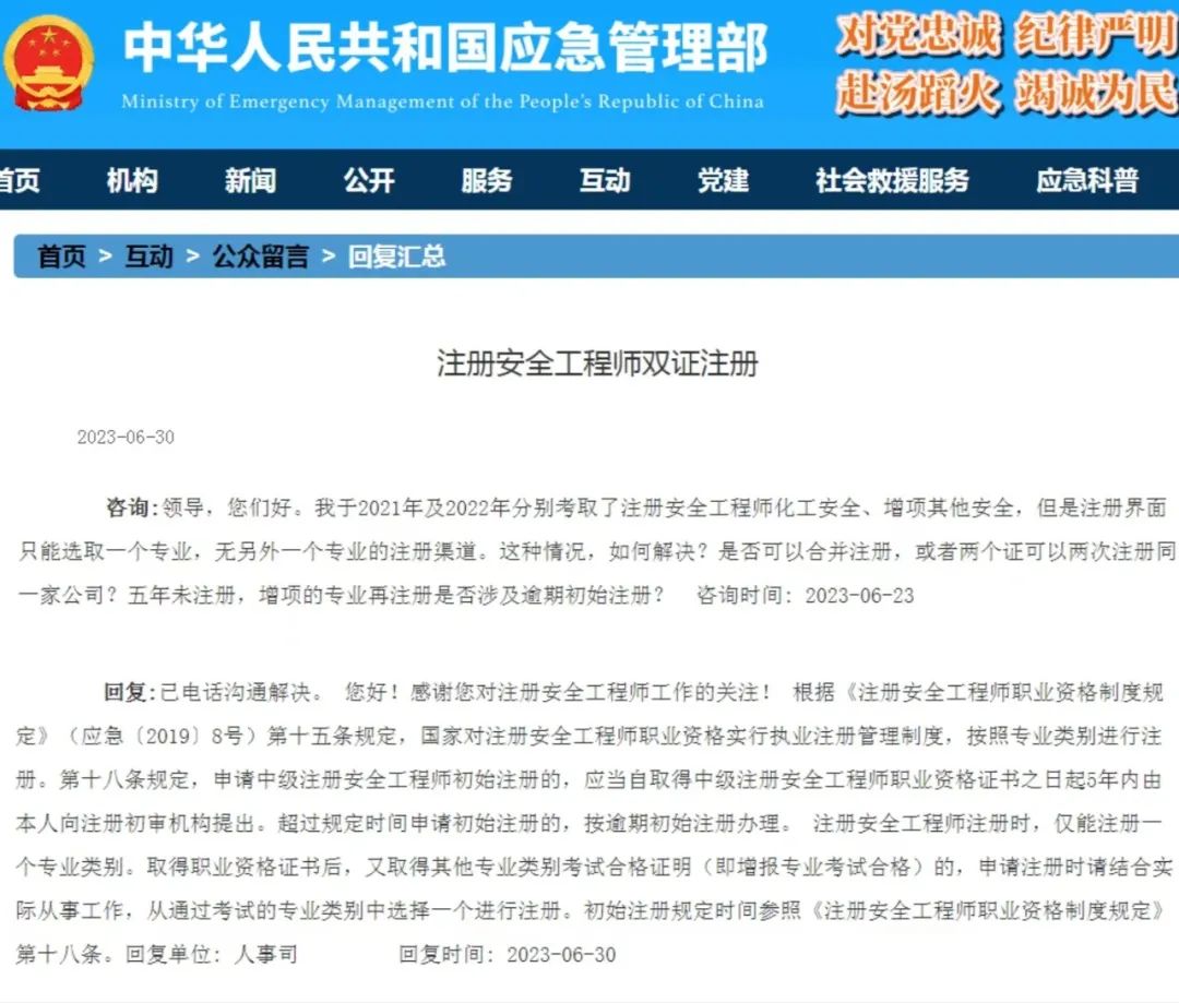 近期,有網(wǎng)友咨詢關(guān)于注冊安全工程師雙證注冊的問題,應(yīng)急管理部給出了相應(yīng)回復(fù),具體內(nèi)容我們一起來看看吧~