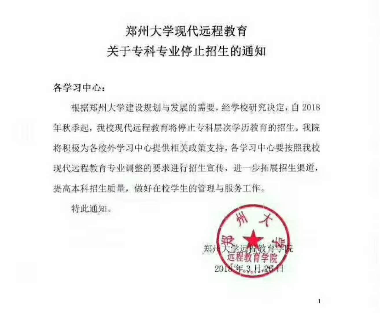 鄭州大學(xué)遠(yuǎn)程教育停止??茖I(yè)招生的通知