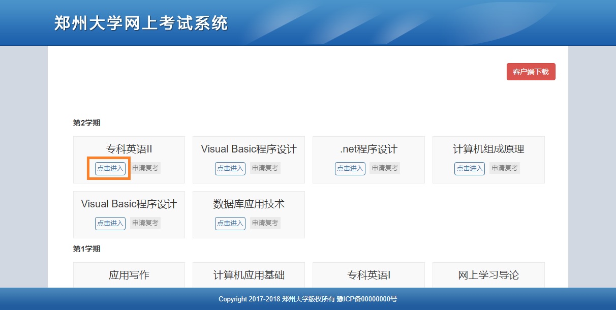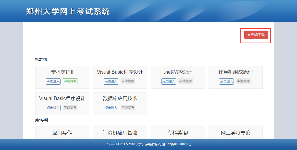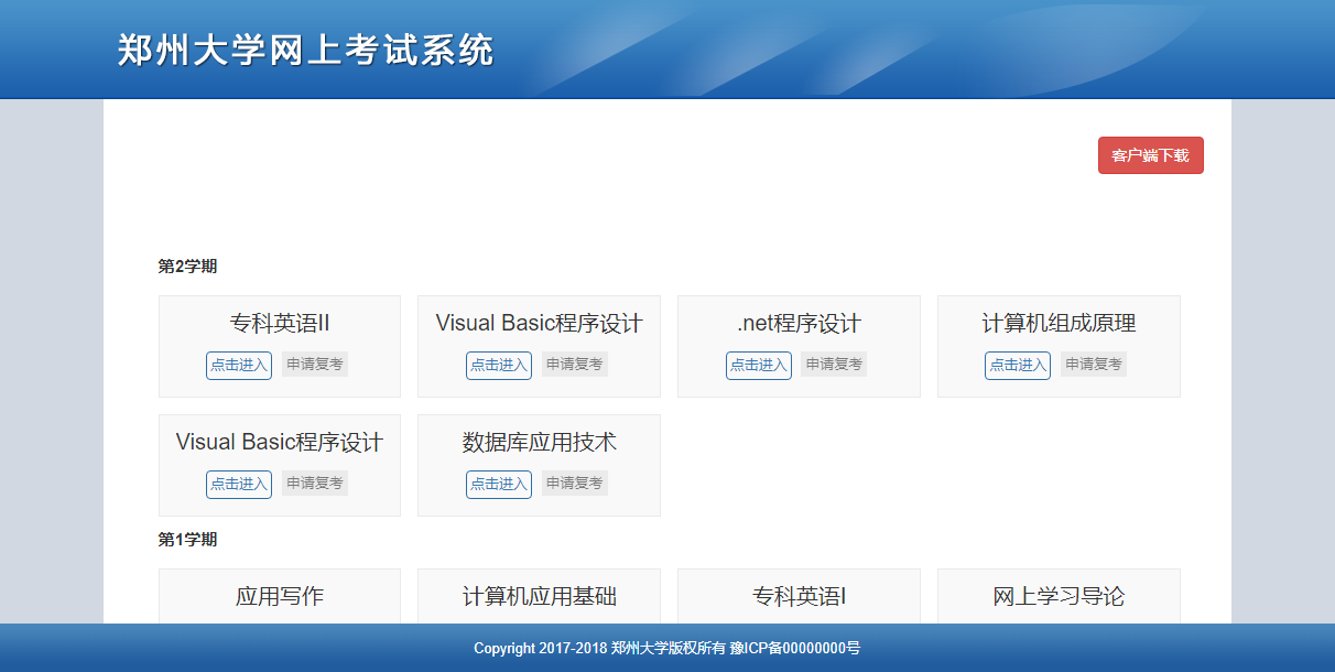 系統(tǒng)主要分為兩大部分,“在線練習(xí)”頁(yè)面和“在線考試”。在線練習(xí)部分采用網(wǎng)頁(yè)形式進(jìn)行,在線考試需要下載客戶端并安裝,在客戶端內(nèi)進(jìn)行考試。首頁(yè)如下圖所示,有學(xué)生課程列表和客戶端下載功能。