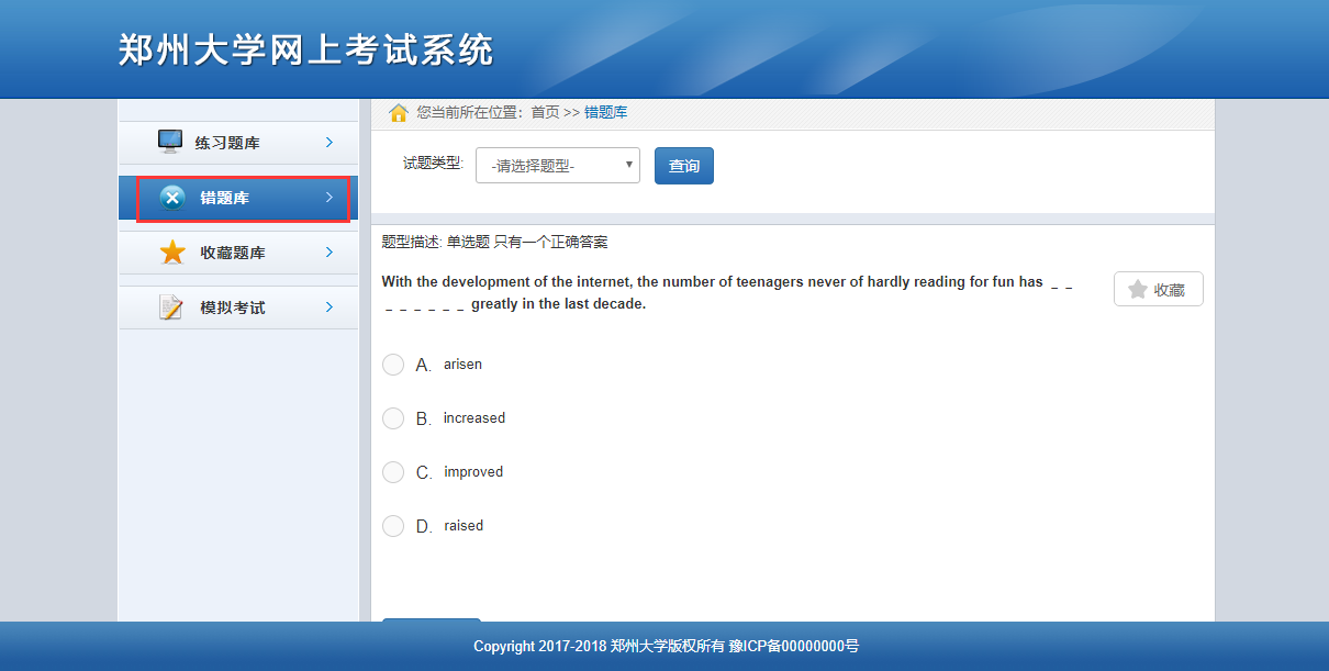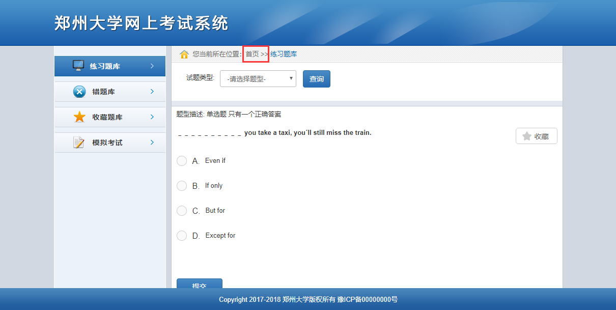 在線練習(xí)頁(yè)面主要包括“練習(xí)題庫(kù)”、“錯(cuò)題庫(kù)”、“收藏題庫(kù)”和“模擬考試”四部分,如下圖所示: