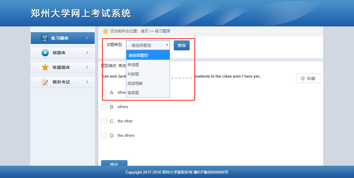 練習(xí)題庫(kù)采用單題練習(xí)的形式進(jìn)行試題練習(xí),可通過(guò)點(diǎn)擊【上一題】【下一題】進(jìn)行試題切換。。試題練習(xí)可隨機(jī)進(jìn)行答題或通過(guò)上方的試題類型下拉菜單選擇題型后點(diǎn)擊【查詢】篩選,針對(duì)某一類題型進(jìn)行練習(xí)。如下圖所示: