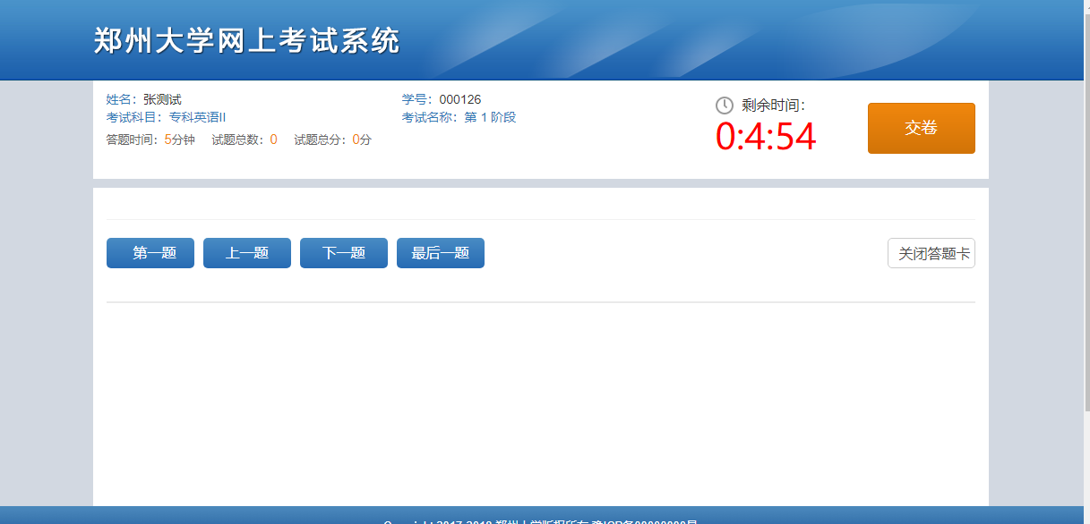 模擬考試頁(yè)面與正式考試一致,展示考生信息,考試倒計(jì)時(shí),學(xué)生可模擬開(kāi)啟/關(guān)閉答題卡,第一題,上一題,下一題,最后一題,交卷,提交成績(jī)等操作,學(xué)生可通過(guò)?!緮M考試】練習(xí)考試時(shí)真實(shí)場(chǎng)景。