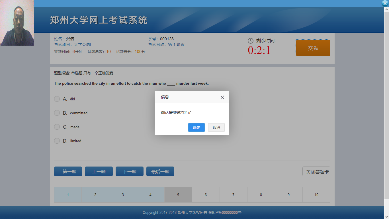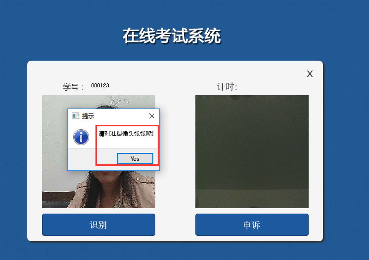 進(jìn)入考試系統(tǒng)后,面部識(shí)別程序會(huì)全程監(jiān)控考生行為,屏幕左上角為監(jiān)控畫(huà)面。如果考試過(guò)程中出現(xiàn)異常情況(不是本人,多張人臉,沒(méi)有人)時(shí),系統(tǒng)會(huì)給出相應(yīng)提示,多次比對(duì)不通過(guò)的,系統(tǒng)會(huì)自動(dòng)退出當(dāng)前考試,本次考試作廢。如圖所示: