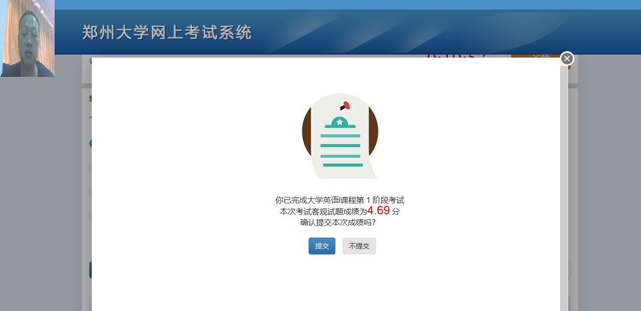 學(xué)生可根據(jù)分?jǐn)?shù)情況確認(rèn)是否提交本次成績(jī),如對(duì)本次考試成績(jī)不滿意,可以不提交本次考試,可對(duì)該課程本階段再次進(jìn)行考試,如提交成績(jī)?cè)撾A段將無(wú)法再次進(jìn)行考試,如下圖所示: