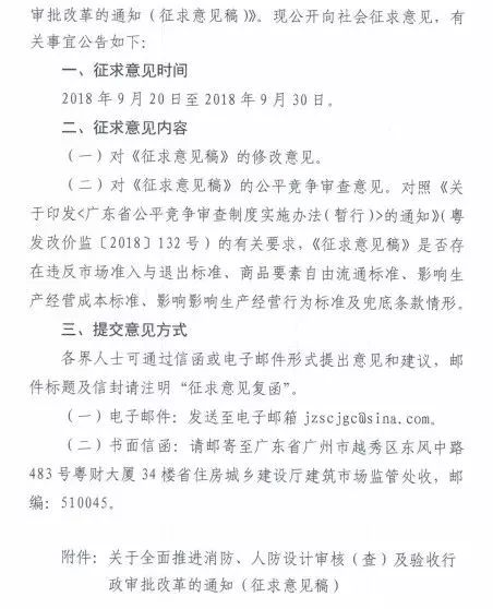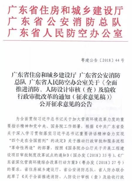 廣東省住房城鄉(xiāng)建設(shè)廳、省公安消防總隊(duì)、省人防辦聯(lián)合起草了《關(guān)于全面推進(jìn)消防、人防設(shè)計(jì)審核(查)及驗(yàn)收行政審批改革的通知(征求意見稿)》,