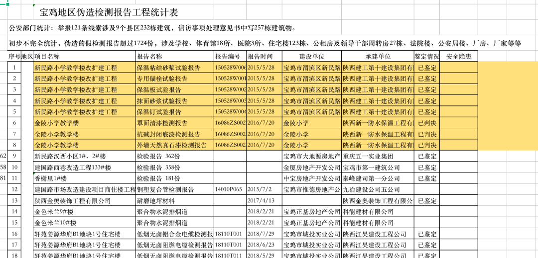 據(jù)記者掌握的相關(guān)材料,截至2020年1月,寶雞市公安局刑事偵查支隊(duì)已查實(shí),存在犯罪事實(shí)(偽造印章出具假報(bào)告)的建筑有32棟,另有135棟建筑正在核查中。