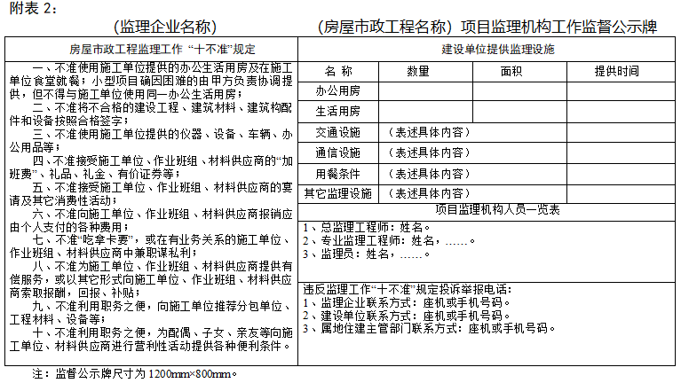 - 各項(xiàng)目監(jiān)理機(jī)構(gòu)應(yīng)在房屋市政工程現(xiàn)場(chǎng)顯著位置,懸掛《項(xiàng)目監(jiān)理機(jī)構(gòu)工作監(jiān)督公示牌》。