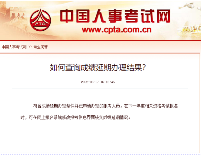 5月17日,中國(guó)人事考試網(wǎng)在“考生問(wèn)答”回復(fù)如下:符合成績(jī)延期辦理?xiàng)l件并已申請(qǐng)辦理的報(bào)考人員,在下一年度相關(guān)資格考試報(bào)名時(shí),可在網(wǎng)上報(bào)名系統(tǒng)修改報(bào)考信息界面核實(shí)成績(jī)延期情況。