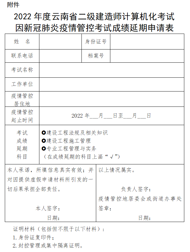 考生身份證正反面掃描件、準(zhǔn)考證掃描件(PDF格式);云南健康碼、通信大數(shù)據(jù)行程卡截圖;上一年度成績(jī)單截圖;涉及考試期間的集中隔離(居家隔離)疫情管控證明;參與新冠肺炎疫情一線防控工作的工作證明;按要求填寫《2022年度云南省二級(jí)建造師計(jì)算機(jī)化考試因新冠肺炎疫情管控考試成績(jī)延期申請(qǐng)表》(詳見附件)。