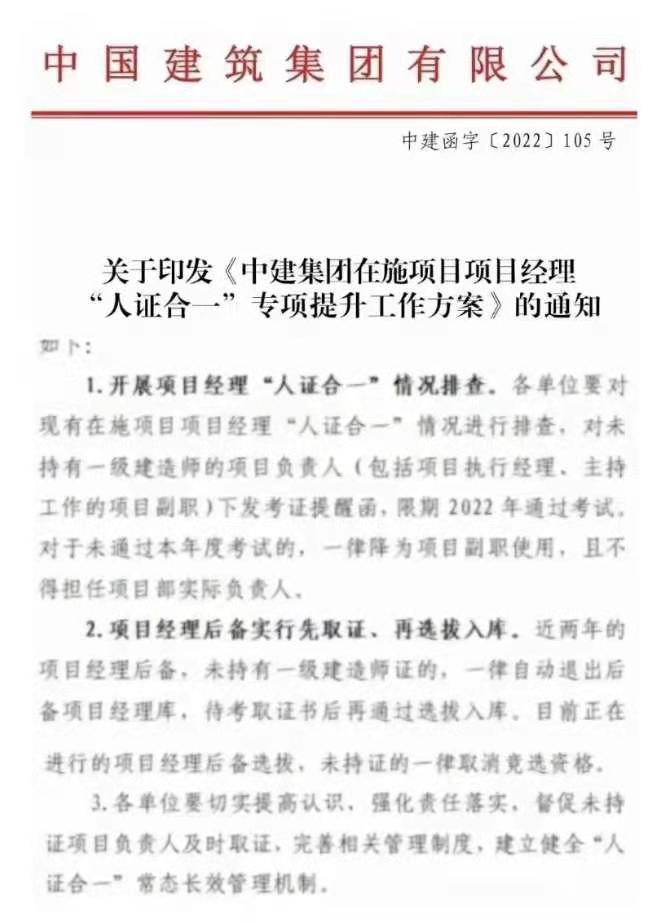近期,中建集團(tuán)下發(fā)了一份人證合一核查的文件,對(duì)于集團(tuán)內(nèi)擔(dān)任項(xiàng)目負(fù)責(zé)人(含執(zhí)行經(jīng)理)而未持有一建的下發(fā)考證提醒函,今年還未通過考試的一律降為項(xiàng)目副職,且不得擔(dān)任實(shí)際負(fù)責(zé)人。