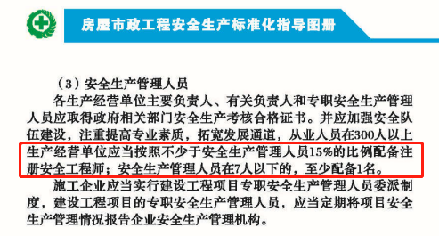 2019年2月1日,住建部辦公廳下發(fā)關(guān)于推廣使用《房屋市政工程安全生產(chǎn)標(biāo)準(zhǔn)化指導(dǎo)圖冊(cè)》的通知。表明從業(yè)人員在300人以上的生產(chǎn)經(jīng)營(yíng)單位應(yīng)當(dāng)按照不少于安全生產(chǎn)管理人員15%的比例配備注冊(cè)安全工程師;安全生產(chǎn)管理人員在7人以下的,至少配備1名。