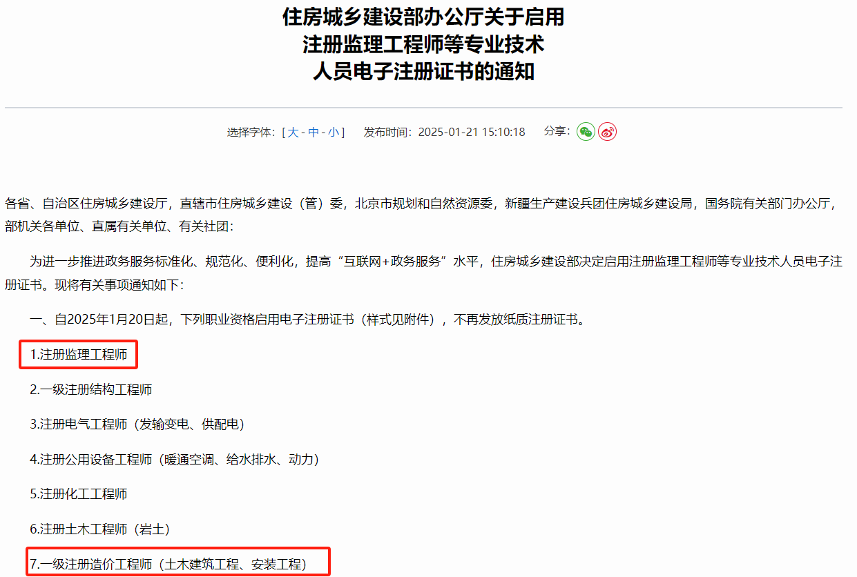 今年1月20號起,7項(xiàng)職業(yè)資格不再發(fā)放紙質(zhì)版證書,全部啟用電子注冊證書,其中包括一造(土建、安裝)和監(jiān)理。