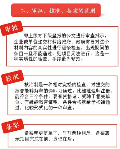 國務院近年來對一些需要政府審批的工程或項目在手續(xù)上進行了簡化,曾先后6次取消了一大批行政審批事項,據(jù)不完全統(tǒng)計大概有超過1000項。改革的目的是放開政府監(jiān)管,市場能自行調(diào)節(jié)或企業(yè)能自主完善的,大力減少審批事項,轉(zhuǎn)而改為核準或者備案。例如:公司登記、基金發(fā)行,當然也包括建造師考試等。于是有人將“取消建造師考試審批”誤解為“取消建造師考試”,以訛傳訛,把謠言傳為“事實”。那么何為審批?跟核準與備案有哪些區(qū)別?