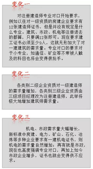 去年,國家公布了最新的企業(yè)資質(zhì)標準,對各資質(zhì)等級、各專業(yè)單位建造師證書的擁有量作了明確的規(guī)定。這一規(guī)定明確表達了建造師考試肯定是不會取消了。這一新的資質(zhì)標準與以往相比有三方面變化。