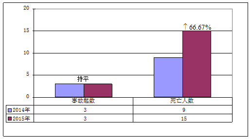 2015年7月,全國共發(fā)生房屋市政工程生產安全較大事故3起、死亡15人,與去年同期事故起數(shù)持平,死亡人數(shù)增加6人,同比上升66.67%(見圖4)。