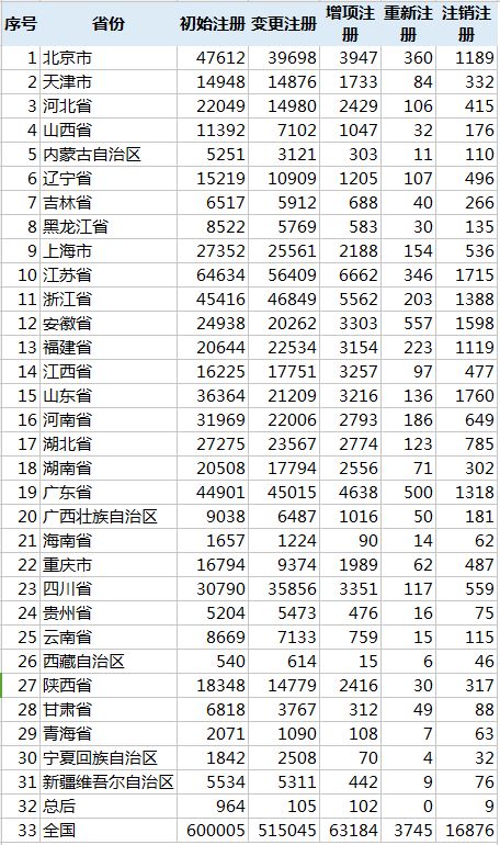 下面看看哪些省份初始注冊最多,變更及注銷多少人?
