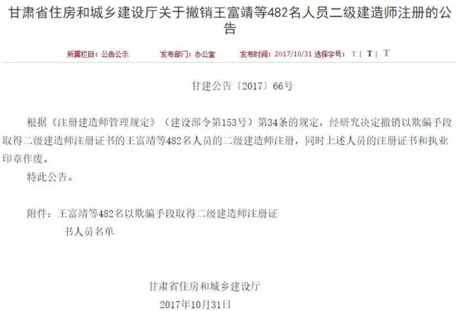 2016年以來,“四庫一平臺”真正發(fā)揮作用,多名注冊人員因“掛證”被通報(bào)或處分。2017年10月底,甘肅省住建廳一次性撤銷482名二級建造師的執(zhí)業(yè)資格,這也是近年來力度最大的一次掛證查處。