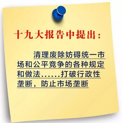 黃勇評價說,“十九大報(bào)告強(qiáng)調(diào)使市場在資源配置中起決定性作用,更好發(fā)揮政府作用,報(bào)告還明確要求清理廢除妨礙統(tǒng)一市場和公平競爭的各種規(guī)定和做法,打破行政壟斷,防止市場壟斷。”