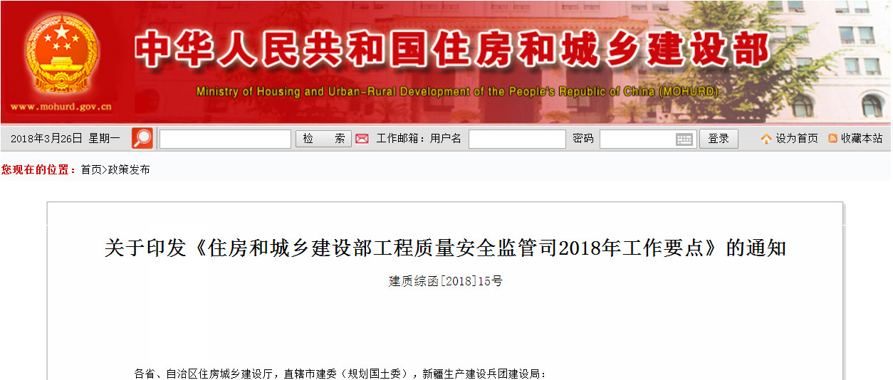 近日,住建部印發(fā)關(guān)于《住房和城鄉(xiāng)建設(shè)部工程質(zhì)量安全監(jiān)管司2018年工作要點》的通知(建質(zhì)綜函[2018]15號)(下文簡稱《通知》)。