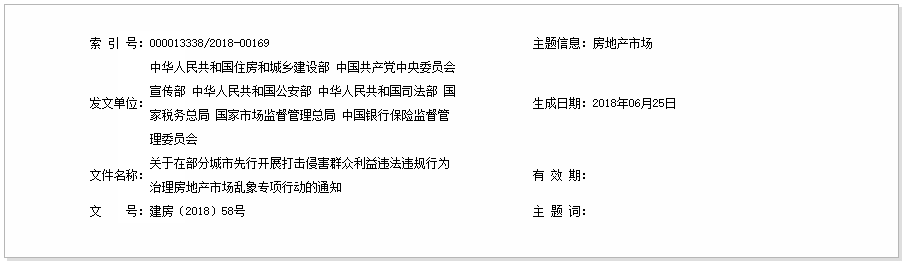 為全面貫徹落實黨中央、國務院關于房地產工作的決策部署,決定于2018年7月初至12月底,在部分城市(名單附后)先行開展打擊侵害群眾利益違法違規(guī)行為、治理房地產市場亂象專項行動?,F將有關事項通知如下: