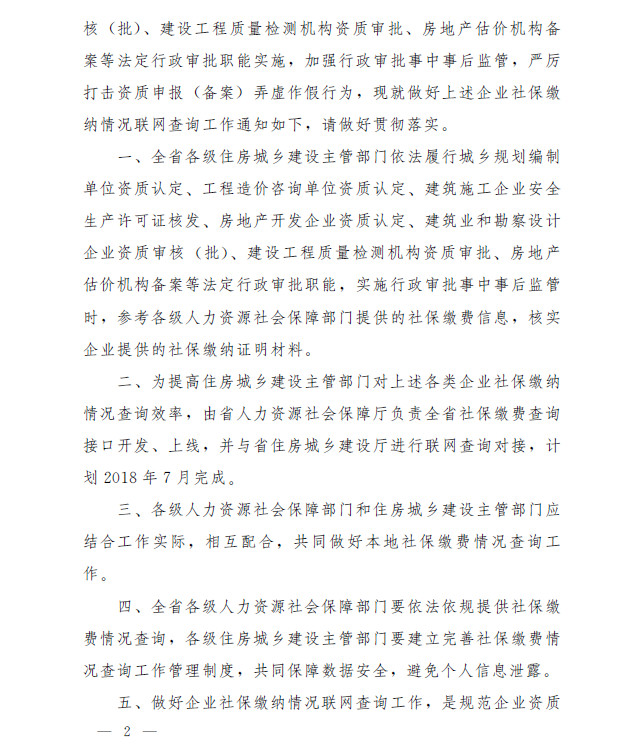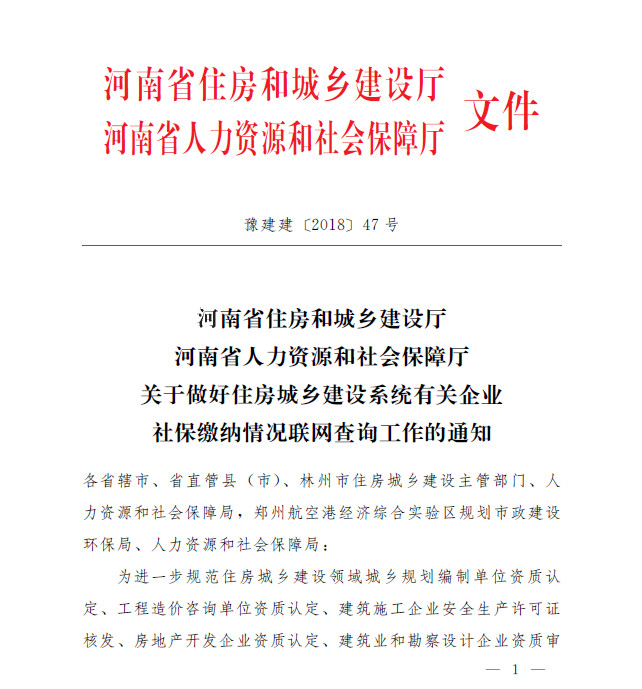 7月11日,河南省住建廳、人社廳正式發(fā)布《河南省住房和城鄉(xiāng)建設(shè)廳河南省人力資源和社會保障廳關(guān)于做好住房城鄉(xiāng)建設(shè)系統(tǒng)有關(guān)企業(yè)社保繳納情況聯(lián)網(wǎng)查詢工作的通知 》,要求在建筑企業(yè)資質(zhì)申報/審批、安全生產(chǎn)許可證核發(fā)時,必須參考各級人力資源社會保障部門提供的社保繳費(fèi)信息,核實企業(yè)提供的社保繳納證明材料。