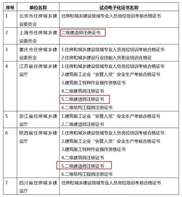 5月23日住建部發(fā)布關(guān)于同意在部分地區(qū)開展住房和城鄉(xiāng)建設(shè)領(lǐng)域從業(yè)人員有關(guān)證書電子化試點的復(fù)函,同意北京市、上海市、重慶市、江蘇省、浙江省、陜西省、四川省開展住房和城鄉(xiāng)建設(shè)領(lǐng)域從業(yè)人員相關(guān)證書電子化試點,電子化證書與紙質(zhì)證書具有同等效力。