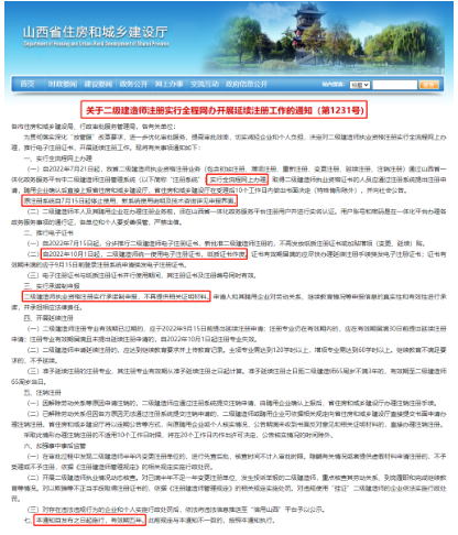 自2022年7月21日起,我省二級建造師執(zhí)業(yè)資格注冊業(yè)務(wù)(包含初始注冊、增項(xiàng)注冊、重新注冊、變更注冊、延續(xù)注冊、注銷注冊)通過山西省一體化政務(wù)服務(wù)平臺中二級建造師注冊管理系統(tǒng)實(shí)行全流程網(wǎng)上辦理。