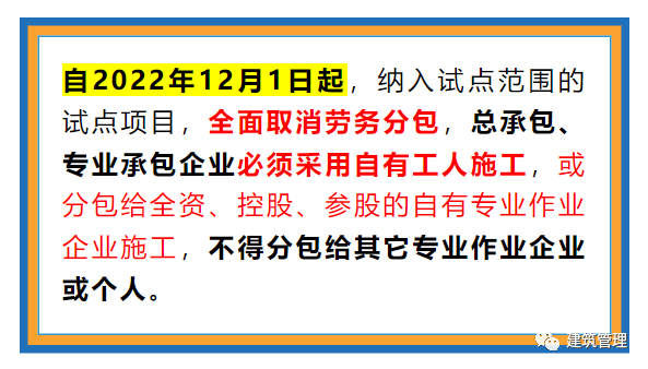 自2022年12月1日起,納入試點范圍的試點項目(主城都市區(qū)政府投資的房屋市政工程以及全市范圍內的技術復雜項目),逐步實現(xiàn)全面自有工人或自有專業(yè)作業(yè)企業(yè)施工。
