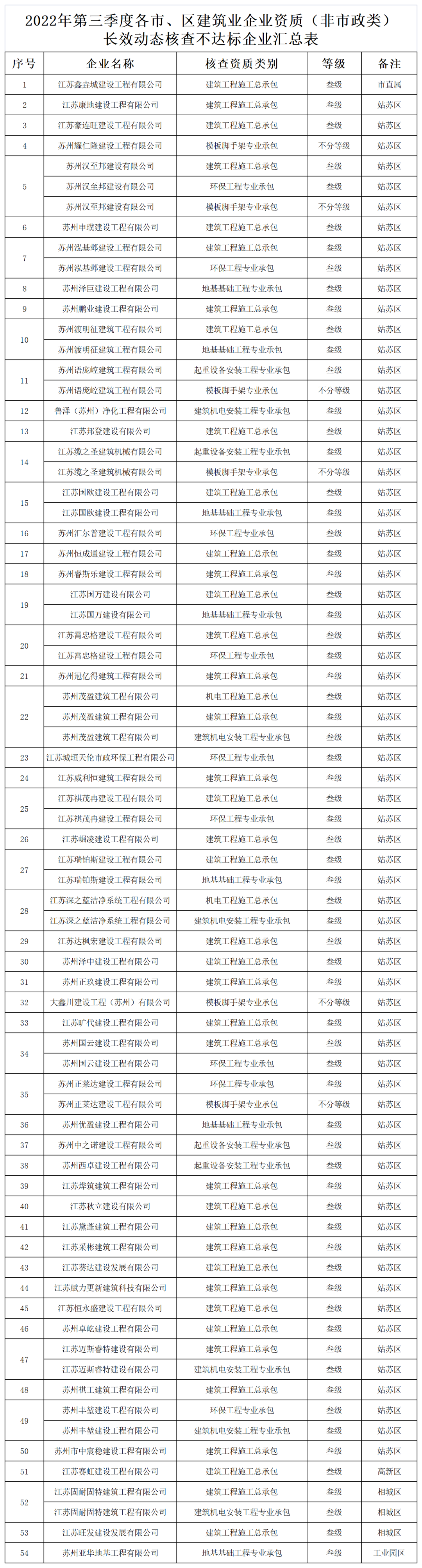 為推進我市建筑業(yè)企業(yè)資質(zhì)事中事后長效監(jiān)管,規(guī)范我市建筑市場秩序,根據(jù)《關(guān)于建立蘇州市建筑業(yè)企業(yè)市級許可施工資質(zhì)(非市政類)動態(tài)核查長效機制的通知》(蘇住建建〔2022〕41號)要求,市住建局組織各縣級市(區(qū))建設(shè)行政主管部門對轄區(qū)內(nèi)建筑業(yè)企業(yè)資質(zhì)(非市政類)開展2022年第三季度資質(zhì)長效動態(tài)核查工作,現(xiàn)將核查情況通報如下: